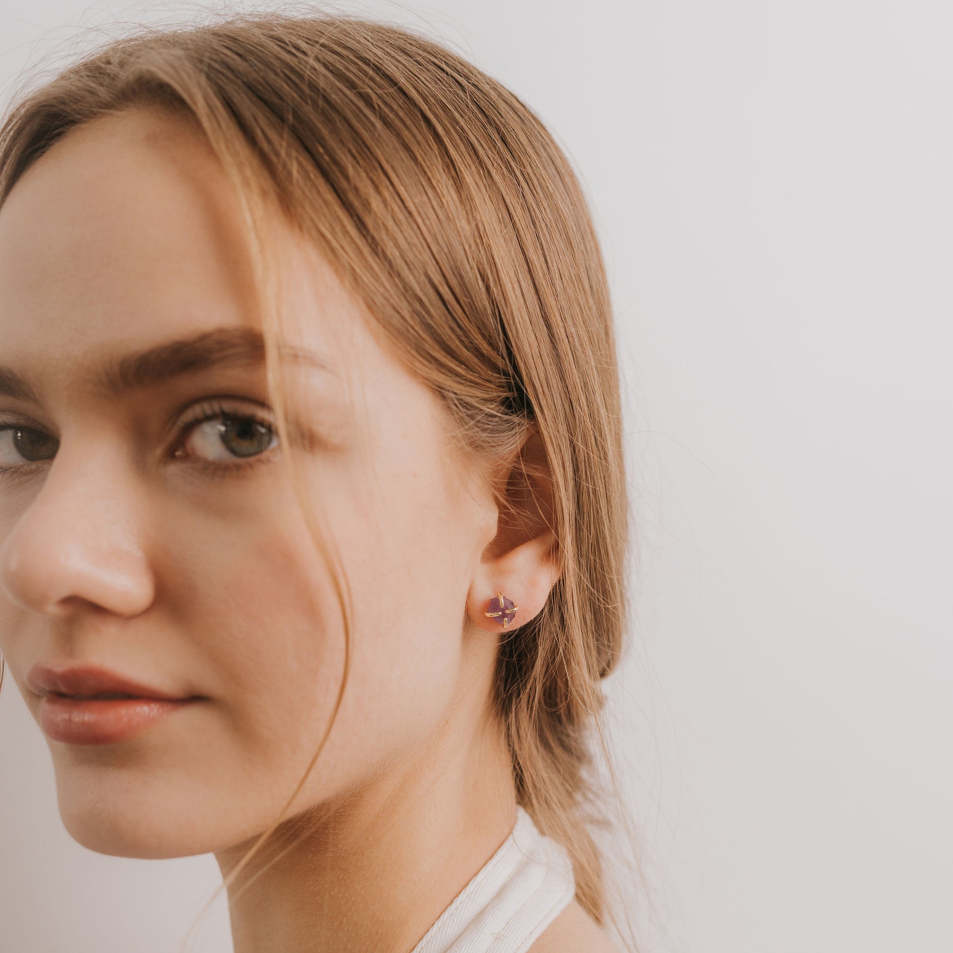 Hand-cut raw stones vary in shape and size. Each stone is set in a 4-prong claw setting. Amethyst stones are known as the healing stone.