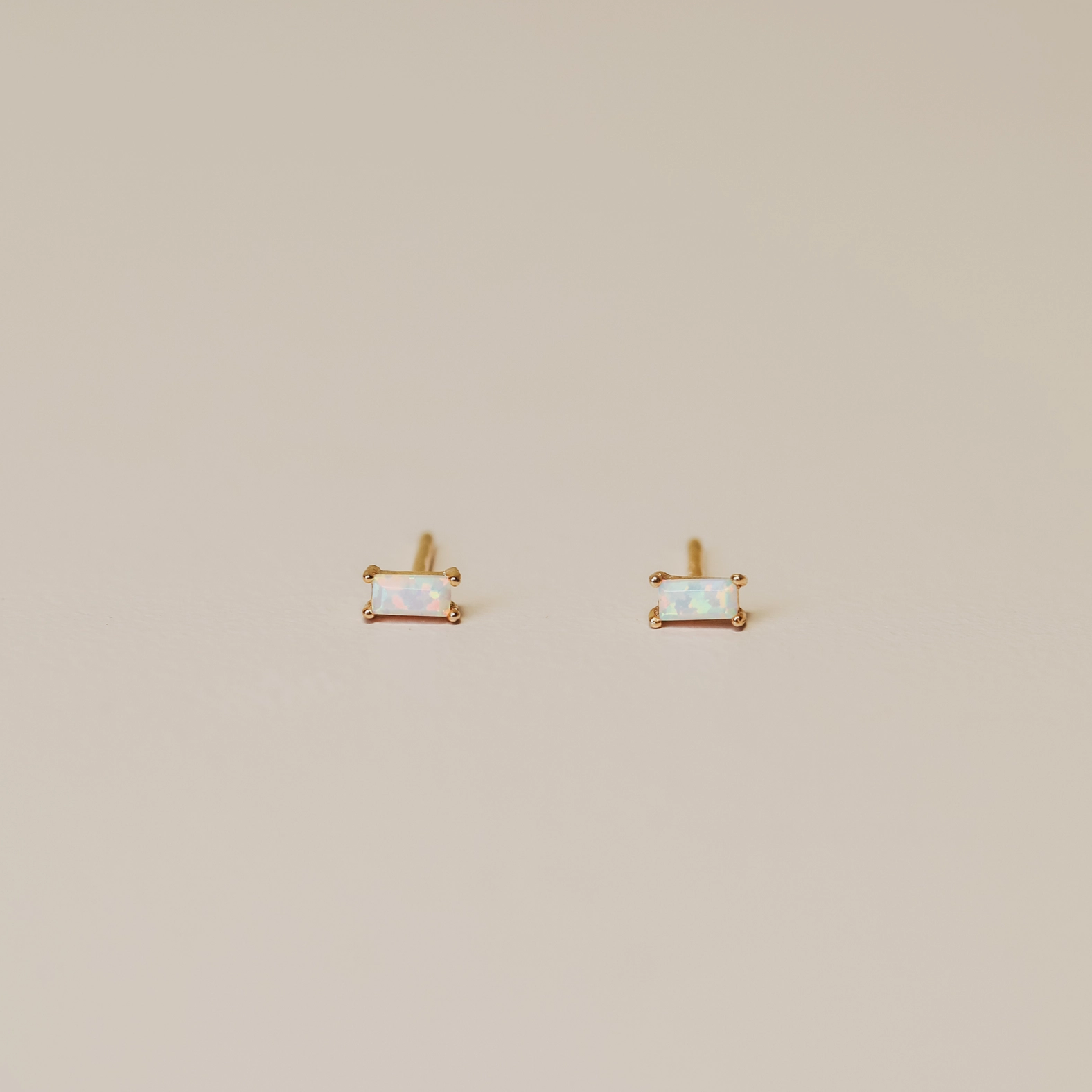 A customer favorite, our opal baguette is made for stacking! It features a petite polished synthetic Opal stone cut into shape and set in an 18k gold-plated prong earring over sterling silver.
