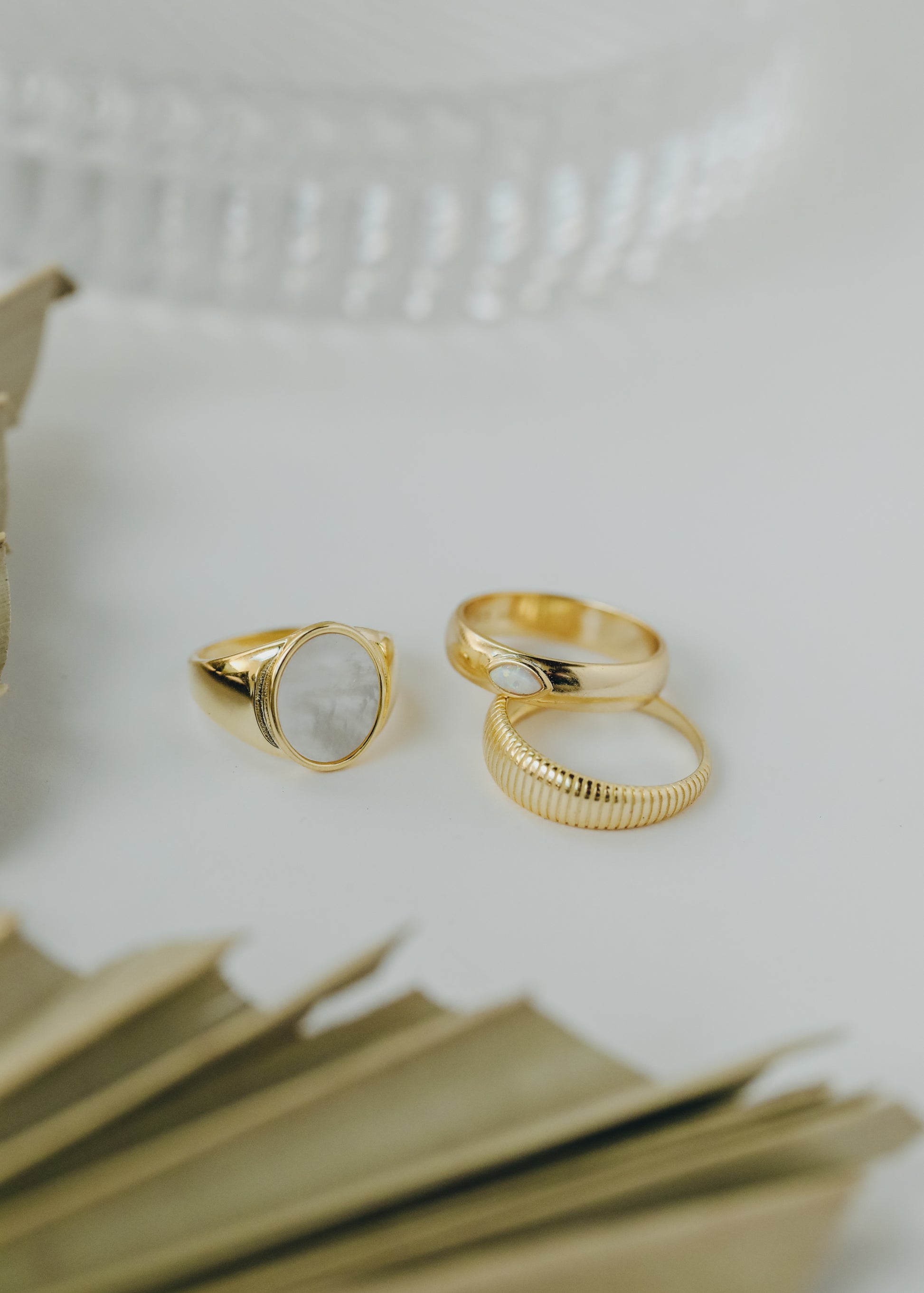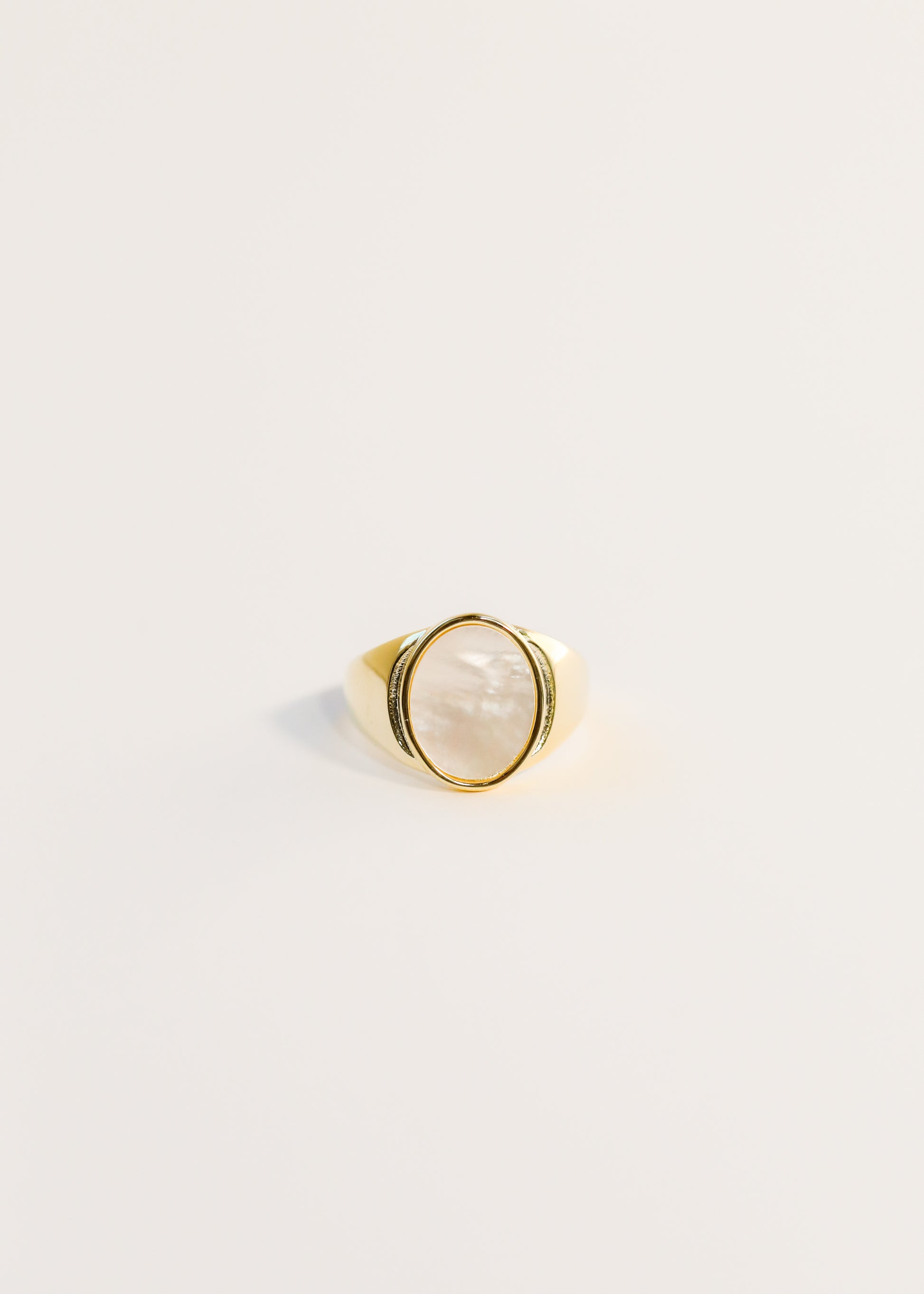 Our take on the ever popular signet style, with a substantial oval of radiant Mother of Pearl to relax and soothe, and a graduating width band of gold. We crafted our collection of rings to make every day a reminder of joy, self-love, and to shine from within! Natural stones will show variation in tones and color, they are sisters not twins.