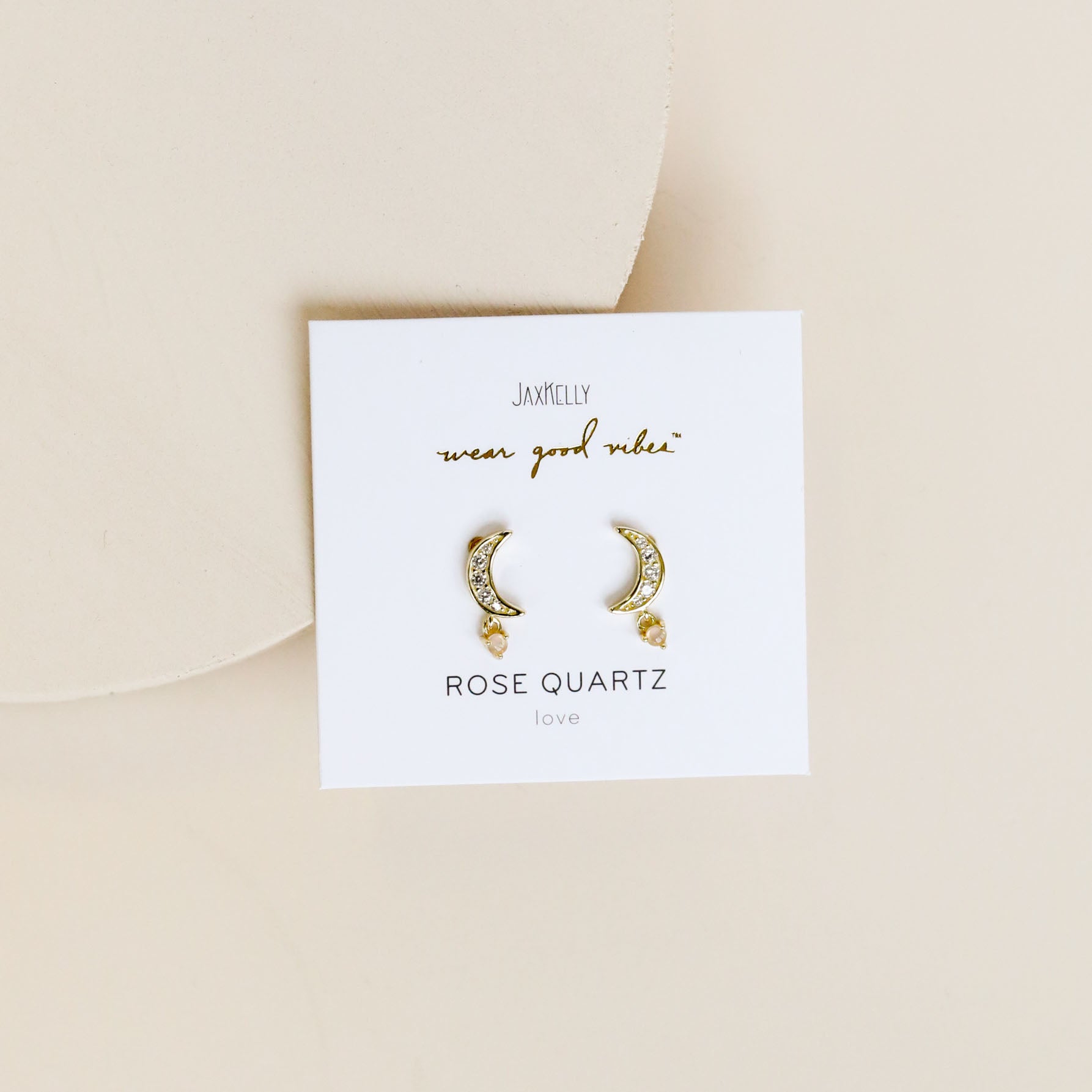 A CZ-encrusted moon stud has a petite gemstone hanging from the center.