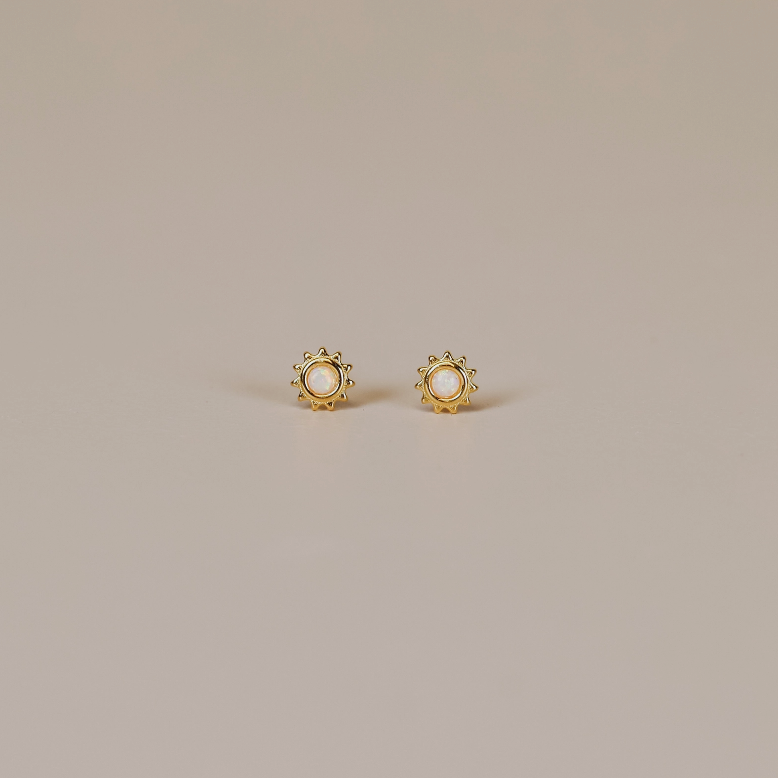 Our number one selling stone is now set in a petite sun. Featuring a petite polished synthetic Opal stone cut into shape and set in an 18k gold-plated prong earring over sterling silver.